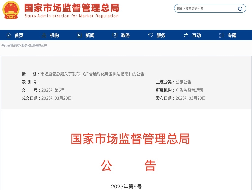 為進(jìn)一步規(guī)范廣告絕對(duì)化用語(yǔ)執(zhí)法,保護(hù)自然人、法人和其他組織的合法權(quán)益,維護(hù)廣告市場(chǎng)秩序,市場(chǎng)監(jiān)管總局于近日發(fā)布《廣告絕對(duì)化用語(yǔ)執(zhí)法指南》(以下簡(jiǎn)稱《指南》),為市場(chǎng)監(jiān)管部門開(kāi)展廣告絕對(duì)化用語(yǔ)監(jiān)管執(zhí)法提供指引。