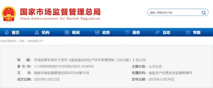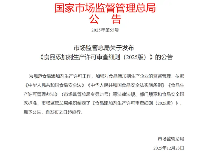 市場監(jiān)管總局關于發(fā)布《食品添加劑生產許可審查細則(2025版)》的公告