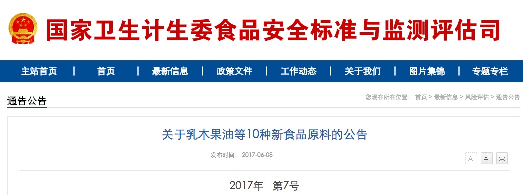根據(jù)《食品安全法》規(guī)定,審評機構(gòu)組織專家對乳木果油等10種新食品原料的安全性評估材料審查并通過。
