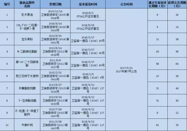 2017年6月13日,時(shí)隔兩年,國家衛(wèi)計(jì)委公告10種新食品原料,我司對(duì)此次公告的10種新食品原料申報(bào)周期進(jìn)行了分析(詳見下表),從獲得受理到批準(zhǔn)公告最短周期為14個(gè)月,最長84個(gè)月,平均42.5個(gè)月。另外,企業(yè)獲得受理前須完成成分分析、衛(wèi)生學(xué)、急性經(jīng)口毒性、三項(xiàng)遺傳毒性、90天經(jīng)口毒性、致畸、安全性評(píng)估意見等報(bào)告及資料,也需要很長時(shí)間。