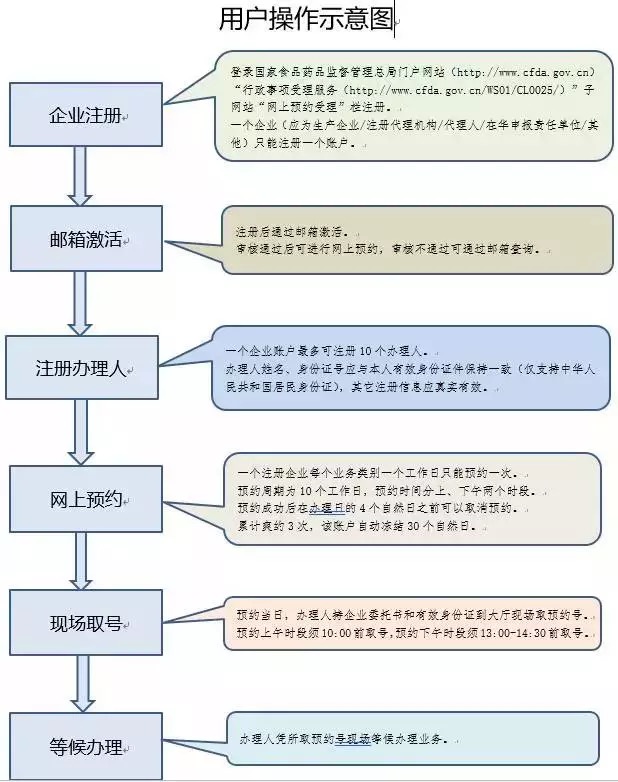 三、注冊方式。2017年7月20日起,申請人可登陸國家食品藥品監(jiān)督管理總局門戶網(wǎng)站“行政事項受理服務”子網(wǎng)站(http://www.cfda.gov.cn/WS01/CL0025/ )提前注冊(詳見用戶操作示意圖)。注冊審核通過后,企業(yè)方可辦理網(wǎng)上預約業(yè)務。
