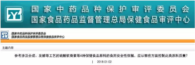 為貫徹執(zhí)行現(xiàn)行技術(shù)審評要求,就近期技術(shù)審評中發(fā)現(xiàn)的無適用國家標準、地方標準、行業(yè)標準的涉及合成、發(fā)酵等工藝生產(chǎn)的硫酸軟骨素等6種保健食品原料,我中心組織專家咨詢會,對注冊申請人提交的這些工藝條件下食用安全性依據(jù)及質(zhì)量控制要求進行了研討。現(xiàn)將相關(guān)情況發(fā)布如下,供保健食品注冊申請時參考。