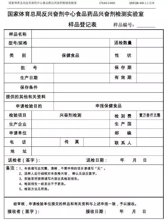 (二)《保健食品檢驗申請表》(見附件二)和《國家體育總局反興奮劑中心食品藥品興奮劑檢測實驗室樣品登記表》(見附件三)的填寫