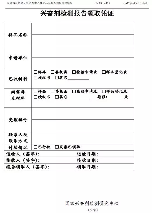 檢測費到賬后,樣品完成受理,進行興奮劑檢測。樣品檢測完畢后將盡快電話通知,領取檢測報告時,請攜帶《興奮劑檢測報告領取憑證》(見附件五)。