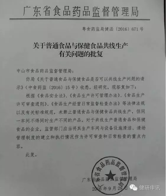 2016年9月,廣東省食藥監(jiān)局批復(fù)中山市食藥監(jiān)局“關(guān)于普通食品與保健食品共線(xiàn)生產(chǎn)的有關(guān)問(wèn)題”一函被公開(kāi)。此函中明確指出“未禁止普通食品與保健食品共線(xiàn)生產(chǎn),但同一車(chē)間不得同時(shí)生產(chǎn)不同的產(chǎn)品”。
