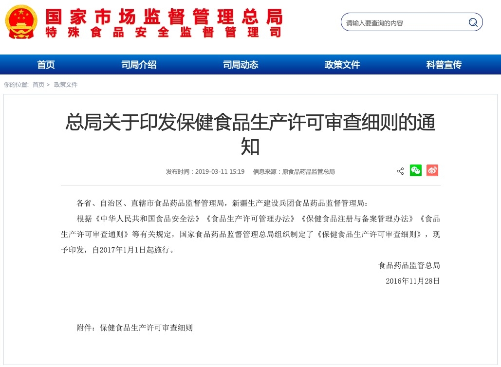 1.3.1國家食品藥品監(jiān)督管理總局負責制定保健食品生產(chǎn)許可審查標準和程序,指導(dǎo)各省級食品藥品監(jiān)督管理部門開展保健食品生產(chǎn)許可審查工作。