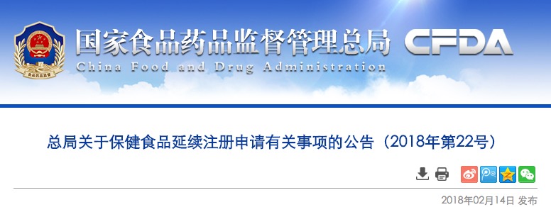 總局關(guān)于保健食品延續(xù)注冊申請有關(guān)事項的公告(2018年第22號)
