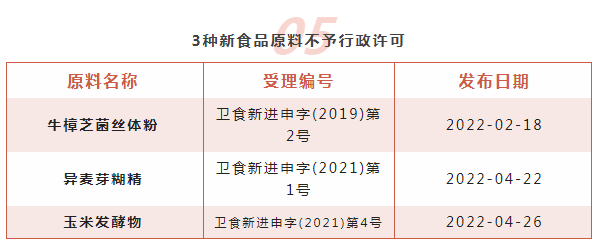 2022年1-7月,國家衛(wèi)生健康委員會共受理瀘州古藺趕黃草、馬尾松松針、桃膠、紅糖低聚果糖等8種新食品原料;對假腸膜明串珠菌、 阿拉伯木聚糖2種新食品原料進(jìn)行意見征求;批準(zhǔn)5種新食品原料,分別是關(guān)山櫻花、吡咯并喹啉醌二鈉鹽、萊茵衣藻、長雙歧桿菌長亞種BB536、甘蔗多酚;不予行政許可的新食品原料有3種,分別是牛樟芝菌絲體粉、異麥芽糊精、玉米發(fā)酵物。